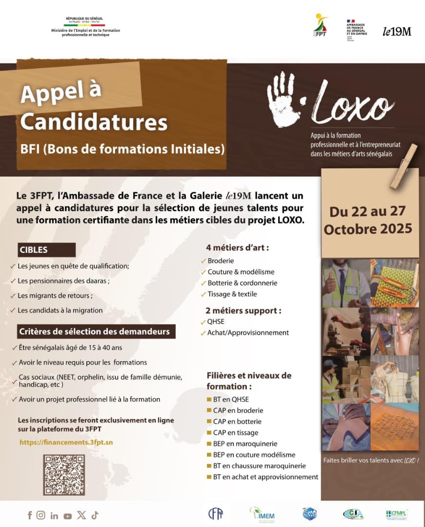 Le 3FPT, l’Ambassade de France au Sénégal (France au Sénégal) et la Galerie Le19M, lancent un appel à candidatures pour financer la formation certifiante de jeunes talents, dans les métiers cibles du projet LOXO :