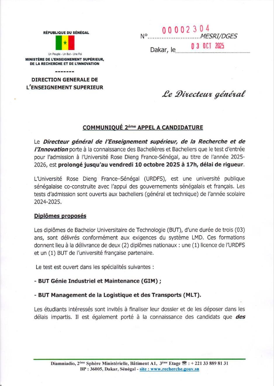 Si vous êtes bachelier(ère) 2024-2025 (général ou technique), vous avez jusqu’au vendredi 10 octobre 2025 à 17h pour postuler et tenter votre chance d’intégrer l’Université Rose Dieng France-Sénégal (URDFS).