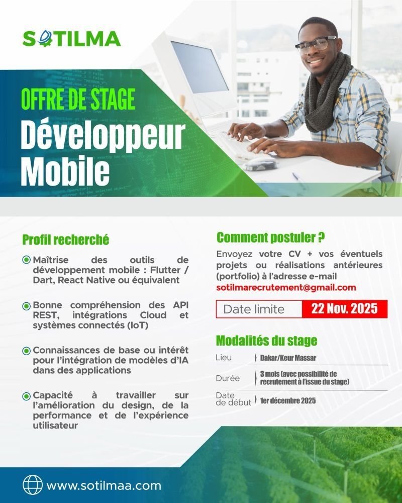 SOTILMA recrute un(e) stagiaire en développement mobile, avec possibilité de recrutement après le stage.