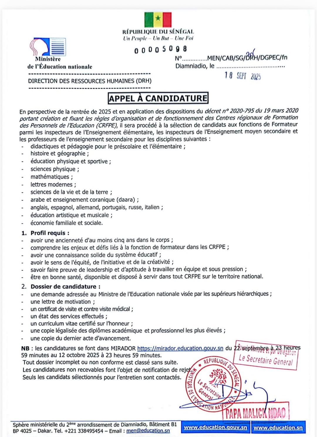 Appel à candidatures pour la sélection de formateurs dans les CRFPE – Rentrée 2025 19 septembre 2025 Commenter Screenshot ETIQUETTEScandidatures Partager cet article Facebook Twitter Whatsapp Whatsapp LinkedIn Email Copy Link Commenter Laisser un commentaire Annuler la réponseVotre adresse e-mail ne sera pas publiée. Les champs obligatoires sont indiqués avec *Commentaire * Nom * E-mail * Site web Enregistrer mon nom, mon e-mail et mon site dans le navigateur pour mon prochain commentaire. Δ Les plus vues Comment faire une demande d’emploi dans la fonction publique? Démarches Communiqué du Ministre de L’enseignement Supérieur , de la Recherche et de L’innovation Actualités Ouverture du concours de recrutement d’élèves – maîtres 2024 (CREM) Concours CREM BAC 2025 –Tout ce qu’il faut savoir sur les premiers résultats Baccalauréat Resultats concours /examens Appel à Candidature pour le recrutement de plusieurs Enseignants Emplois Recrutement Les plus récents La Laiterie du Berger recrute un Assistant(e) Contrôleur de Gestion Emplois Recrutement Global Talent recrute un Stagiaire Digital (H/F) Actualités Emplois Recrutement Mercy Corps Sénégal recrute un Manager Finance Emplois Recrutement Recrutement d’un Chargé de Communication Digitale Junior Emplois Recrutement Intelcia recrute un Conseillers techniques Emplois Recrutement