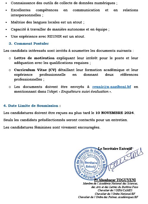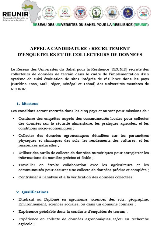 Le Réseau des Universités du Sahel pour la Résilience (REUNIR) recrute des collecteurs de données de terrain dans le cadre de l’implémentation d’un système de suivi évaluation de sites intégrés de résilience dans les pays (Burkina Faso, Mali, Niger, Sénégal et Tchad) des universités membres de REUNIR.