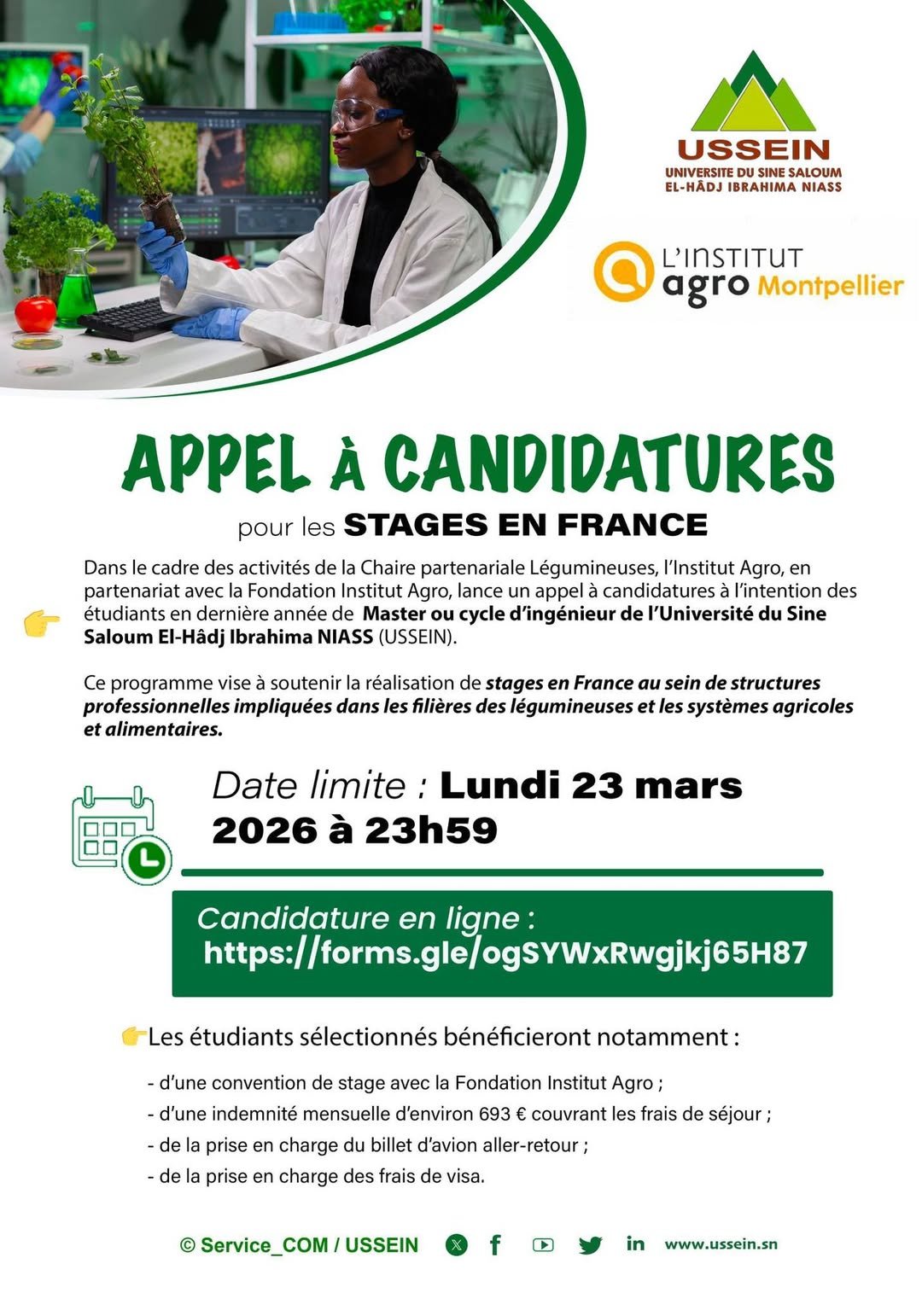 L’#InstitutAgro, en partenariat avec la Fondation Institut Agro, lance un appel à candidatures destiné aux étudiants en dernière année de Master ou cycle d’ingénieur de l’Université du Sine Saloum El Hadj Ibrahima Niass (#USSEIN) pour la réalisation de stages en France dans les domaines liés aux systèmes agricoles et alimentaires, notamment les filières des légumineuses.