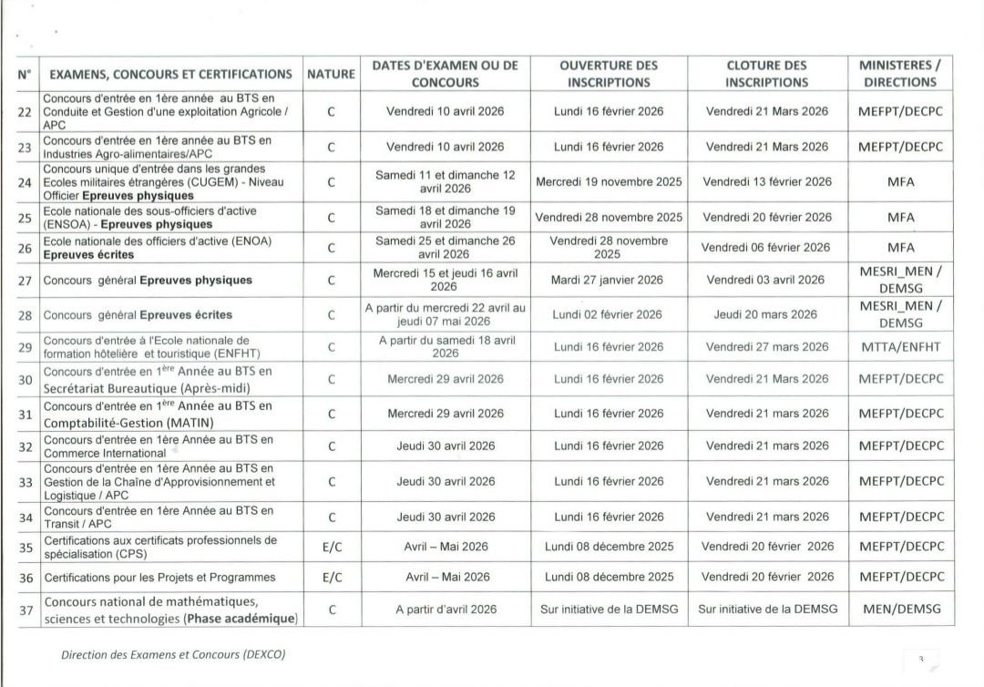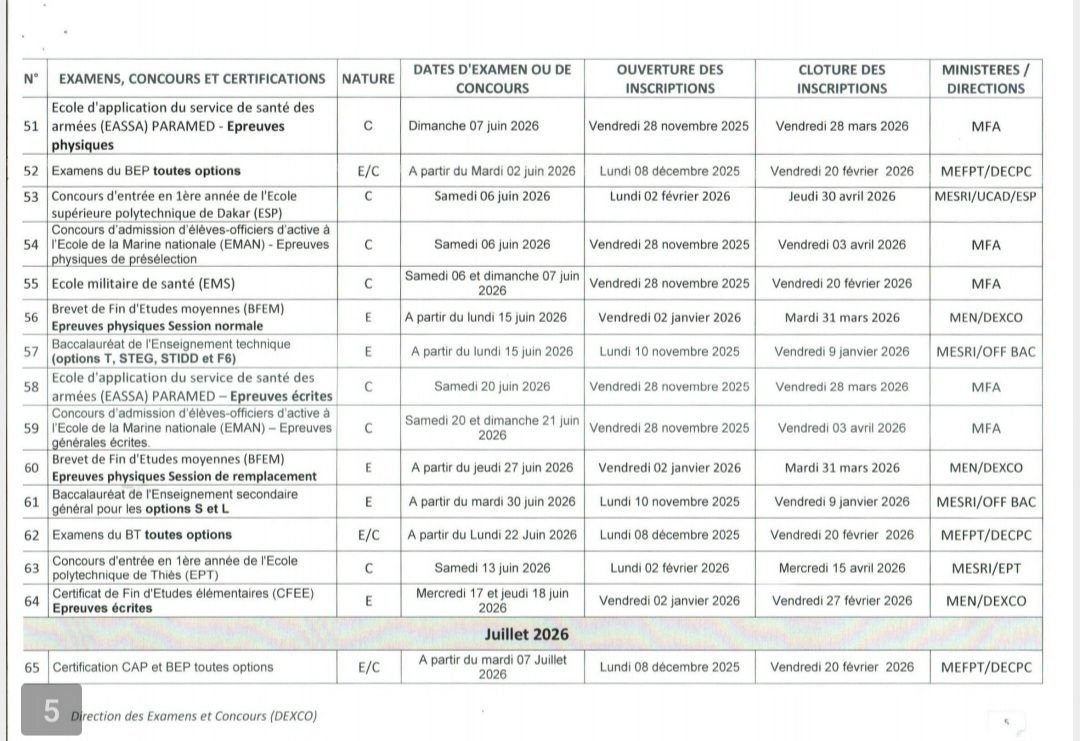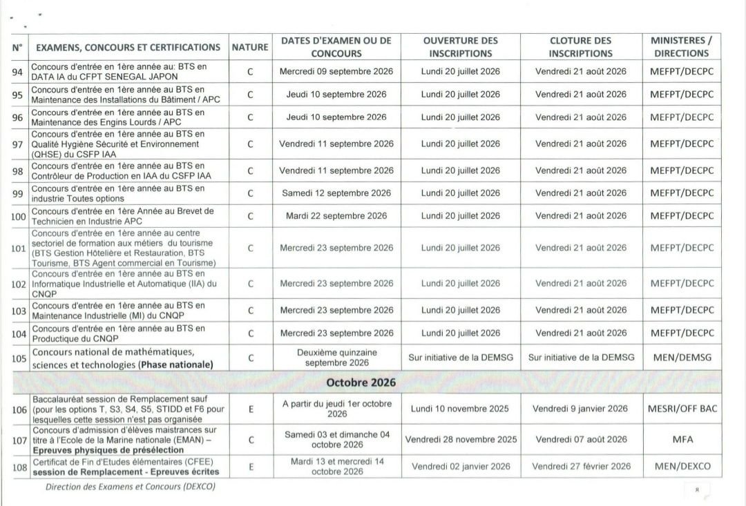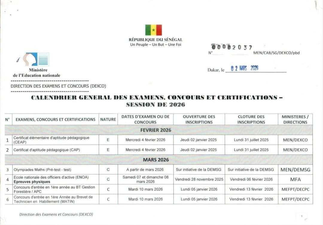 Calendrier général des 119 Examens, Concours et Certification session 2026.… En voir plus 3 mars 2026 Commenter ETIQUETTESConcours Partager cet article Facebook Twitter Whatsapp Whatsapp LinkedIn Email Copy Link Commenter Laisser un commentaire Annuler la réponseVotre adresse e-mail ne sera pas publiée. Les champs obligatoires sont indiqués avec *Commentaire * Nom * E-mail * Site web Enregistrer mon nom, mon e-mail et mon site dans le navigateur pour mon prochain commentaire. Δ Les plus vues Comment faire une demande d’emploi dans la fonction publique? Démarches Communiqué du Ministre de L’enseignement Supérieur , de la Recherche et de L’innovation Actualités Ouverture du concours de recrutement d’élèves – maîtres 2024 (CREM) Concours CREM BAC 2025 –Tout ce qu’il faut savoir sur les premiers résultats Baccalauréat Resultats concours /examens Appel à Candidature pour le recrutement de plusieurs Enseignants Emplois Recrutement Les plus récents Recrutement d’un(e) Assistant(e) en Ressources Humaines Emplois Recrutement IBS recrute un Assistant(e) en Ressources Humaines Emplois Recrutement SOS Village d’enfants Sénégal recrute un Sage-Femme Emplois Recrutement Total Energies recrute un Ingénieur commercial mines Emplois Recrutement L’Agence Nationale des Affaires Maritimes (ANAM) recrute un Ingénieur logiciel Emplois Recrutement