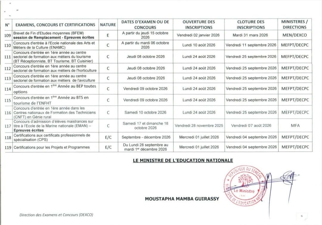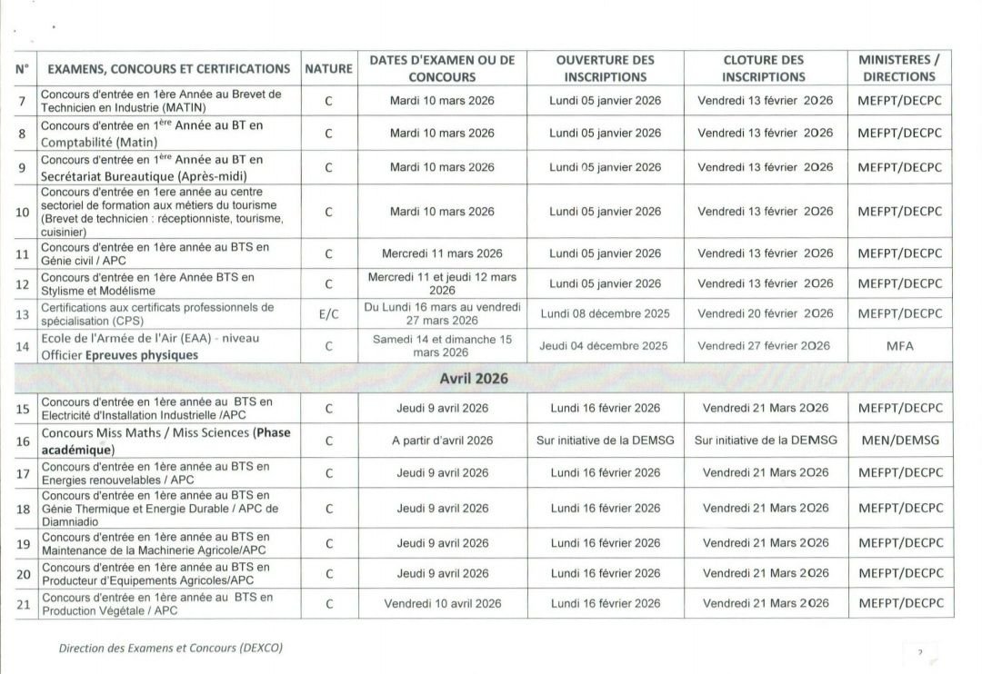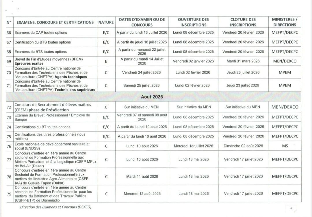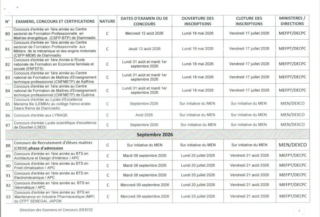 Calendrier général des 119 Examens, Concours et Certification session 2026.… En voir plus 3 mars 2026 Commenter ETIQUETTESConcours Partager cet article Facebook Twitter Whatsapp Whatsapp LinkedIn Email Copy Link Commenter Laisser un commentaire Annuler la réponseVotre adresse e-mail ne sera pas publiée. Les champs obligatoires sont indiqués avec *Commentaire * Nom * E-mail * Site web Enregistrer mon nom, mon e-mail et mon site dans le navigateur pour mon prochain commentaire. Δ Les plus vues Comment faire une demande d’emploi dans la fonction publique? Démarches Communiqué du Ministre de L’enseignement Supérieur , de la Recherche et de L’innovation Actualités Ouverture du concours de recrutement d’élèves – maîtres 2024 (CREM) Concours CREM BAC 2025 –Tout ce qu’il faut savoir sur les premiers résultats Baccalauréat Resultats concours /examens Appel à Candidature pour le recrutement de plusieurs Enseignants Emplois Recrutement Les plus récents Recrutement d’un(e) Assistant(e) en Ressources Humaines Emplois Recrutement IBS recrute un Assistant(e) en Ressources Humaines Emplois Recrutement SOS Village d’enfants Sénégal recrute un Sage-Femme Emplois Recrutement Total Energies recrute un Ingénieur commercial mines Emplois Recrutement L’Agence Nationale des Affaires Maritimes (ANAM) recrute un Ingénieur logiciel Emplois Recrutement