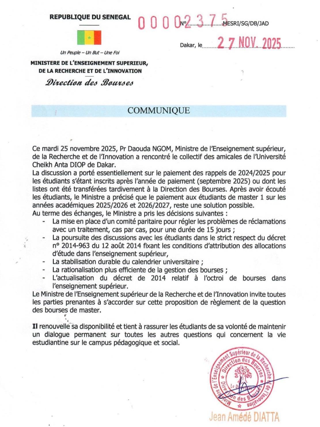 Communiqué de la Direction des bourses 27 novembre 2025 Commenter ETIQUETTESdirection des bourses Partager cet article Facebook Twitter Whatsapp Whatsapp LinkedIn Email Copy Link Commenter Laisser un commentaire Annuler la réponseVotre adresse e-mail ne sera pas publiée. Les champs obligatoires sont indiqués avec *Commentaire * Nom * E-mail * Site web Enregistrer mon nom, mon e-mail et mon site dans le navigateur pour mon prochain commentaire. Δ Les plus vues Comment faire une demande d’emploi dans la fonction publique? Démarches Communiqué du Ministre de L’enseignement Supérieur , de la Recherche et de L’innovation Actualités Ouverture du concours de recrutement d’élèves – maîtres 2024 (CREM) Concours CREM BAC 2025 –Tout ce qu’il faut savoir sur les premiers résultats Baccalauréat Resultats concours /examens Appel à Candidature pour le recrutement de plusieurs Enseignants Emplois Recrutement Les plus récents Serviq SARL recrute des Téléconseillers en Energie Emplois Recrutement Recrutement d’un 03 enseignants-chercheurs en Physique Emplois Recrutement Recrutement de 03 enseignants-chercheurs en Mathématiques Emplois Recrutement Recrutement de 02 enseignants-chercheurs en Mathématiques Emplois Recrutement Recrutement d’un enseignant-chercheur en Informatique Emplois Recrutement