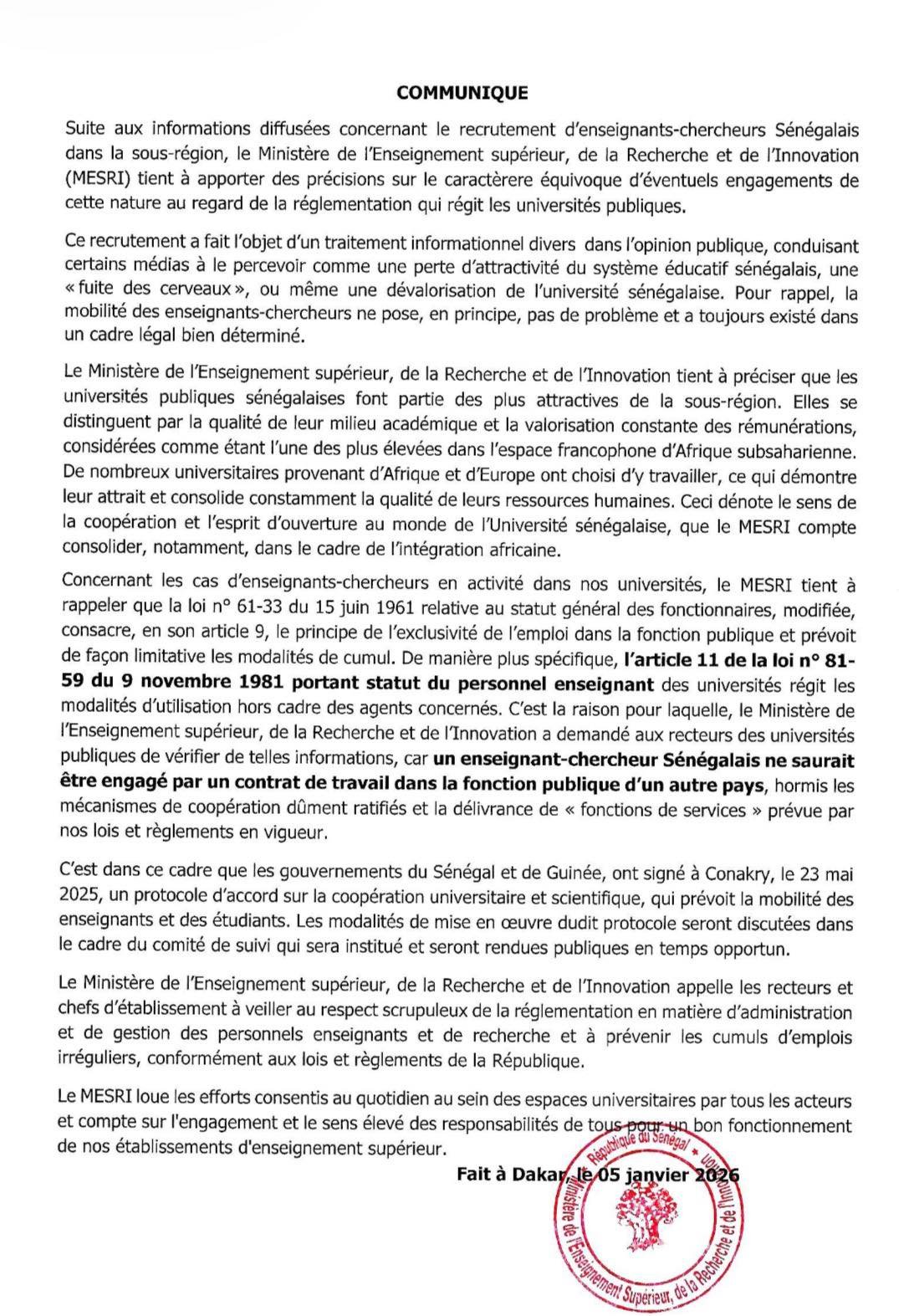 Communiqué : Précisions du MESRI sur la mobilité et le recrutement des enseignants-chercheurs sénégalais 5 janvier 2026 Commenter Précisions du MESRI sur la mobilité et le recrutement des enseignants-chercheurs sénégalais Screenshot ETIQUETTESenseignants Partager cet article Facebook Twitter Whatsapp Whatsapp LinkedIn Email Copy Link Commenter Laisser un commentaire Annuler la réponseVotre adresse e-mail ne sera pas publiée. Les champs obligatoires sont indiqués avec *Commentaire * Nom * E-mail * Site web Enregistrer mon nom, mon e-mail et mon site dans le navigateur pour mon prochain commentaire. Δ Les plus vues Comment faire une demande d’emploi dans la fonction publique? Démarches Communiqué du Ministre de L’enseignement Supérieur , de la Recherche et de L’innovation Actualités Ouverture du concours de recrutement d’élèves – maîtres 2024 (CREM) Concours CREM BAC 2025 –Tout ce qu’il faut savoir sur les premiers résultats Baccalauréat Resultats concours /examens Appel à Candidature pour le recrutement de plusieurs Enseignants Emplois Recrutement Les plus récents UCAD : violences et panique sur le campus lors des affrontements avec la police Emplois Recrutement Ucad : Des étudiants au secours d’un de leur camarade touché Emplois Recrutement Affrontements à l’UCAD : Des étudiantes incommodées par des gaz lacrymogènes, la vidéo qui fait le tour des réseaux sociaux Emplois Recrutement Topwork recrute un Agents administratifs terrain Emplois Recrutement Tensions à l’UCAD : L’ENSETP suspend les cours en présentiel et bascule en ligne Actualités UCAD Université