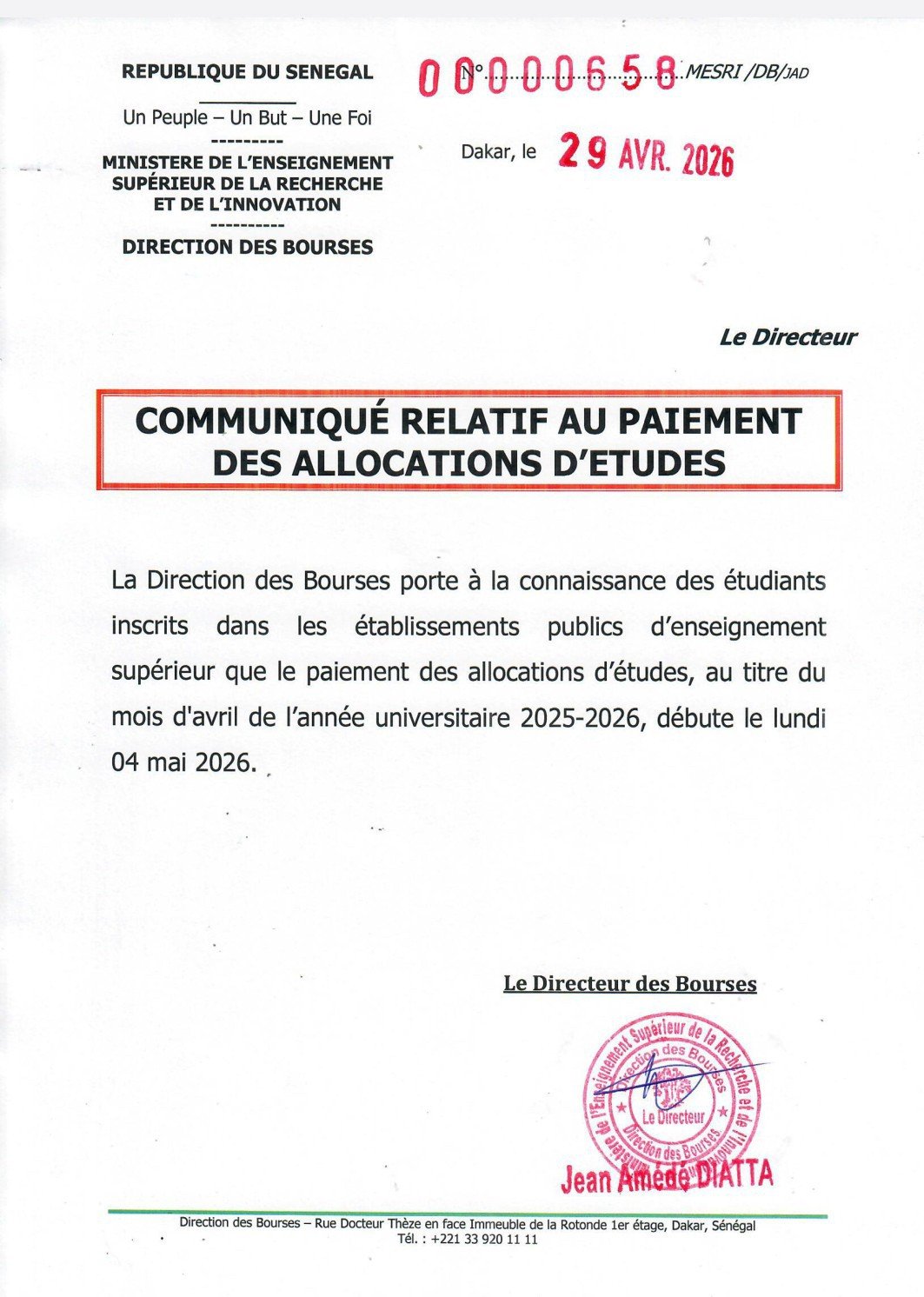 Communiqué relatif au payement des allocations d’études 30 avril 2026 Commenter Partager cet article Facebook Twitter Whatsapp Whatsapp LinkedIn Email Copy Link Commenter Laisser un commentaire Annuler la réponseVotre adresse e-mail ne sera pas publiée. Les champs obligatoires sont indiqués avec *Commentaire * Nom * E-mail * Site web Enregistrer mon nom, mon e-mail et mon site dans le navigateur pour mon prochain commentaire. Δ Les plus vues Comment faire une demande d’emploi dans la fonction publique? Démarches Communiqué du Ministre de L’enseignement Supérieur , de la Recherche et de L’innovation Actualités Ouverture du concours de recrutement d’élèves – maîtres 2024 (CREM) Concours CREM BAC 2025 –Tout ce qu’il faut savoir sur les premiers résultats Baccalauréat Resultats concours /examens Concours Eaux et Forêts / Session 2025 : Conditions, Dates et Documents à fournir Concours Les plus récents Concours Direct d’Entrée 2026 a l’École Nationale des Travailleurs Sociaux Spécialisés (ENTSS) Concours Norela Immo Services recrute un Commercial Terrain Immobilier Emplois Recrutement C2K STAFFING SARL recrute plusieurs profils Emplois Recrutement SIGA Corporate recrute un Stagiaire Assistante Communication Recrutement Stages Comité d’Organisation des Jeux Olympiques de la Jeunesse Dakar 2026 recrute un Coordinateur de Bénévoles H/F Emplois Recrutement