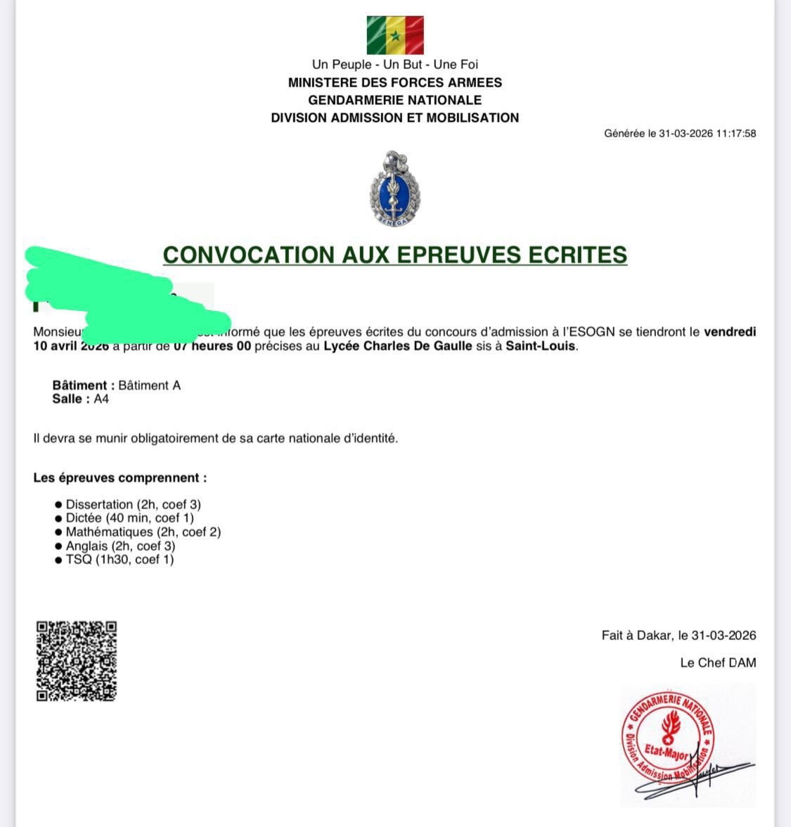 DÉSORMAIS LES CONVOCATIONS AUX ÉPREUVES ÉCRITES SONT DISPONIBLES SUR LA PLATEFORME esogn.gendarmerie.sn