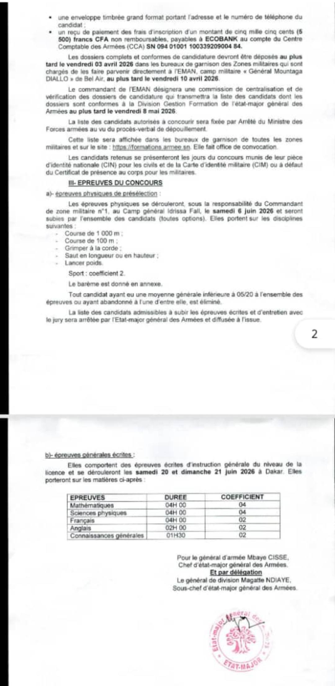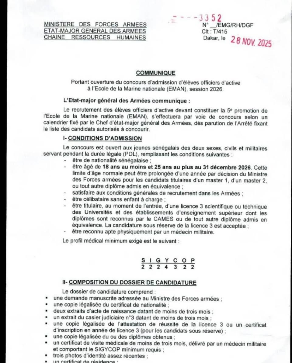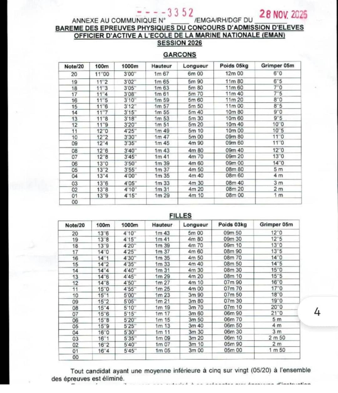 Concours d’admission d’élèves sous officiers active à l’école de la marine nationale, Session 2026