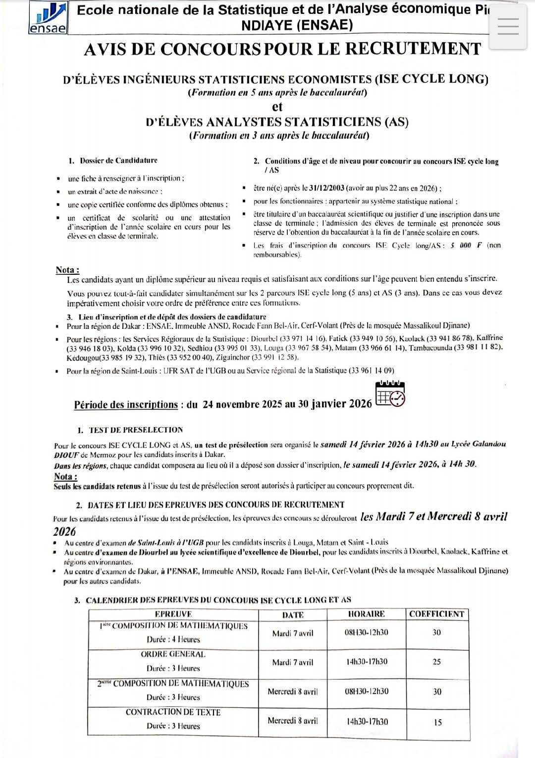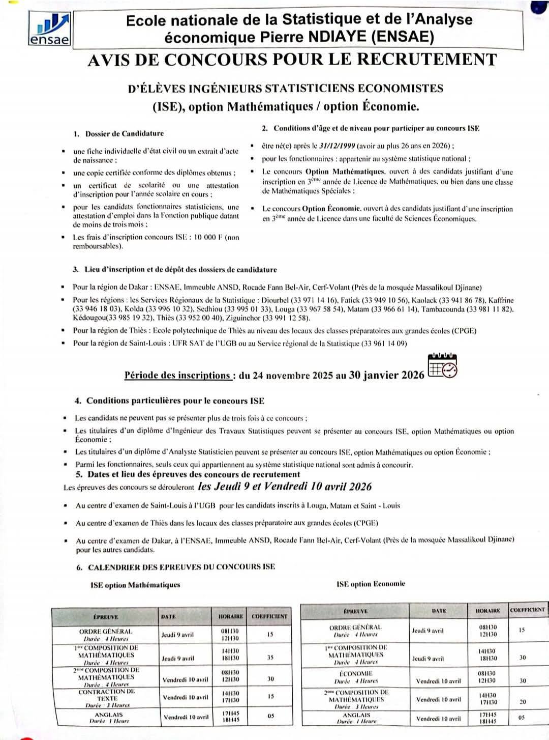 La 𝐃𝐢𝐫𝐞𝐜𝐭𝐢𝐨𝐧 𝐝𝐞𝐬 𝐒𝐭𝐚𝐭𝐢𝐬𝐭𝐢𝐪𝐮𝐞𝐬 𝐞𝐭 𝐝𝐞 𝐥’𝐄́𝐜𝐨𝐧𝐨𝐦𝐢𝐞 (ENSAE) annonce officiellement l’ouverture du concours 2026 pour le recrutement des futurs experts en 𝐬𝐭𝐚𝐭𝐢𝐬𝐭𝐢𝐪𝐮𝐞, 𝐞́𝐜𝐨𝐧𝐨𝐦𝐢𝐞 et 𝐚𝐧𝐚𝐥𝐲𝐬𝐞 𝐝𝐞 𝐝𝐨𝐧𝐧𝐞́𝐞𝐬. Une opportunité unique pour bâtir une carrière solide dans un secteur stratégique et hautement demandé.