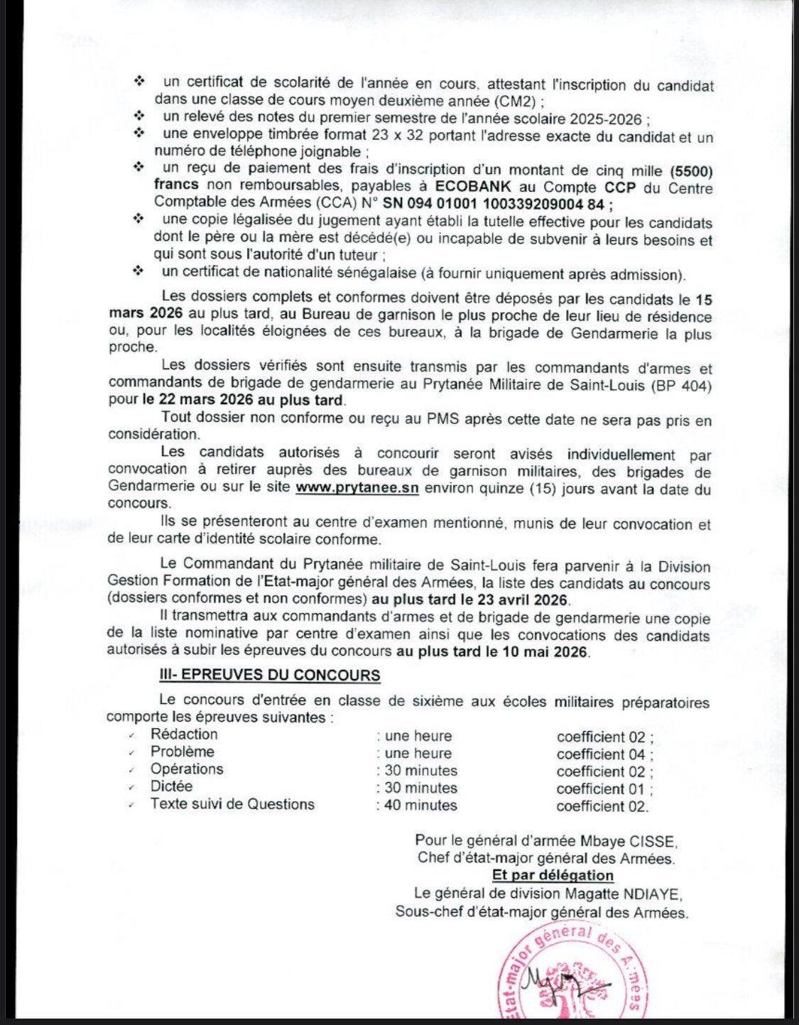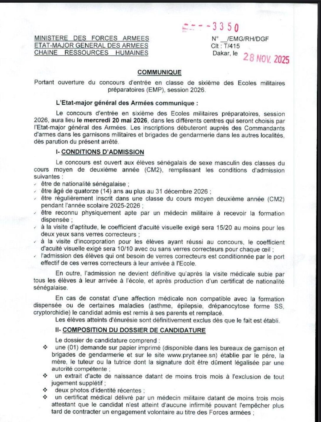 Concours d’entrée en classe de sixième des Écoles Militaires Préparatoires (EMP), session 2026 9 décembre 2025 Commenter ETIQUETTESConcours Partager cet article Facebook Twitter Whatsapp Whatsapp LinkedIn Email Copy Link Commenter Laisser un commentaire Annuler la réponseVotre adresse e-mail ne sera pas publiée. Les champs obligatoires sont indiqués avec *Commentaire * Nom * E-mail * Site web Enregistrer mon nom, mon e-mail et mon site dans le navigateur pour mon prochain commentaire. Δ Les plus vues Comment faire une demande d’emploi dans la fonction publique? Démarches Communiqué du Ministre de L’enseignement Supérieur , de la Recherche et de L’innovation Actualités Ouverture du concours de recrutement d’élèves – maîtres 2024 (CREM) Concours CREM BAC 2025 –Tout ce qu’il faut savoir sur les premiers résultats Baccalauréat Resultats concours /examens Appel à Candidature pour le recrutement de plusieurs Enseignants Emplois Recrutement Les plus récents RECRUTEMENT : PRODEME RECRUTE UN(E) COMPTABLE DE PRÉFÉRENCE NIVEAU BTS Emplois Recrutement Résultats concours direct d’entrée à l’ENDSS Emplois Recrutement La Mairie de Khombole lance un appel à candidatures pour les postes suivants : Emplois Recrutement OFFRES DE RECRUTEMENT Emplois Recrutement jangalma recrute un Professeur Emplois Recrutement