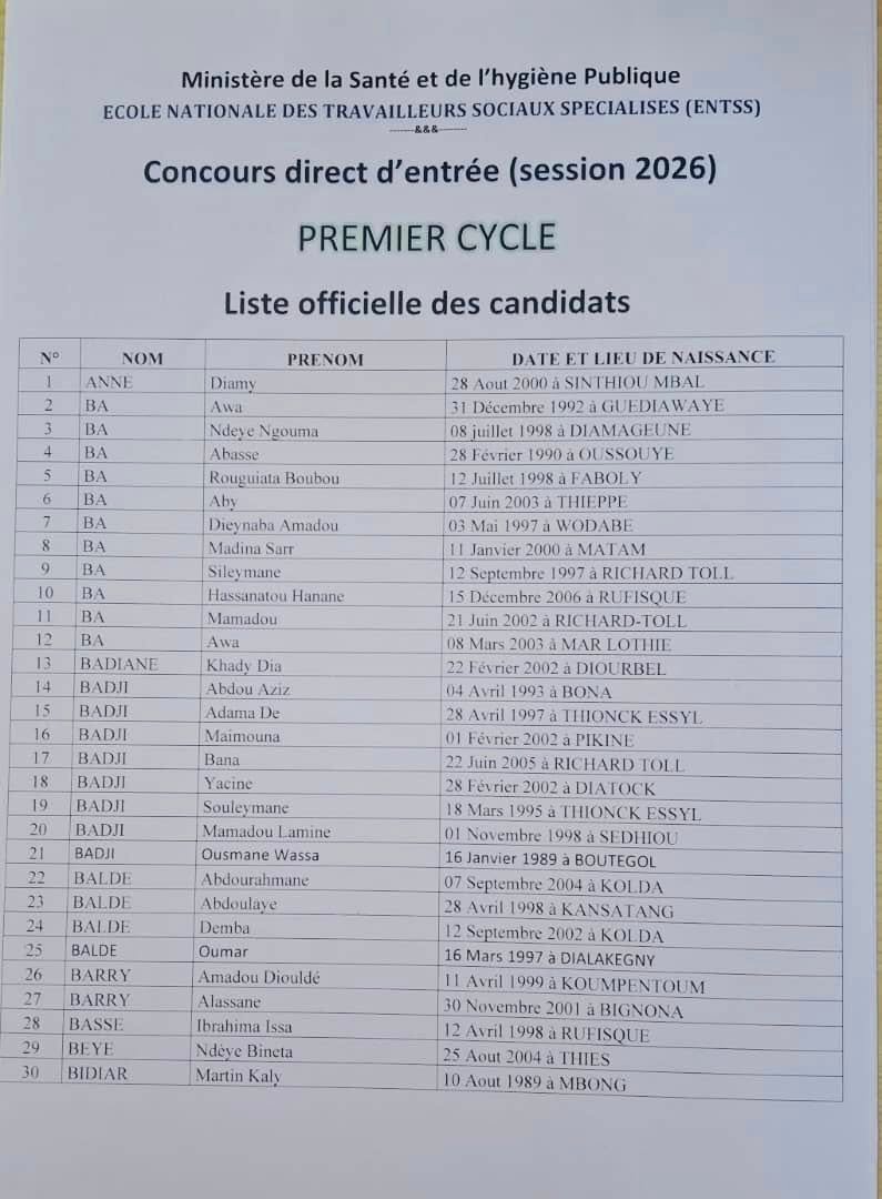 L’École Nationale des Travailleurs Sociaux Spécialisés (ENTSS) porte à la connaissance des candidats au Concours direct d’entrée (session 2026) que les listes pour le PREMIER CYCLE sont désormais disponibles.