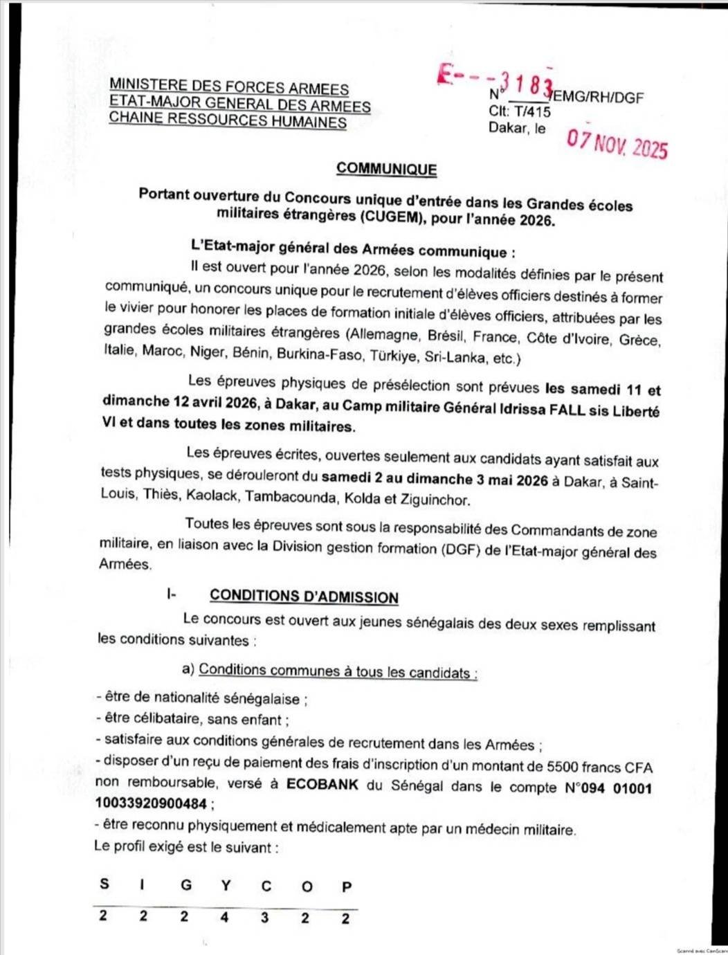 Concours unique d’entrée dans les Grandes écoles militaires étrangères (CUGEM), pour I’année 2026. 11 novembre 2025 Commenter Communiqué ouverture CUGEM 2026 ETIQUETTESConcours Partager cet article Facebook Twitter Whatsapp Whatsapp LinkedIn Email Copy Link Commenter Laisser un commentaire Annuler la réponseVotre adresse e-mail ne sera pas publiée. Les champs obligatoires sont indiqués avec *Commentaire * Nom * E-mail * Site web Enregistrer mon nom, mon e-mail et mon site dans le navigateur pour mon prochain commentaire. Δ Les plus vues Comment faire une demande d’emploi dans la fonction publique? Démarches Communiqué du Ministre de L’enseignement Supérieur , de la Recherche et de L’innovation Actualités Ouverture du concours de recrutement d’élèves – maîtres 2024 (CREM) Concours CREM BAC 2025 –Tout ce qu’il faut savoir sur les premiers résultats Baccalauréat Resultats concours /examens Appel à Candidature pour le recrutement de plusieurs Enseignants Emplois Recrutement Les plus récents Agence hybride recrute une Cuisinière & Femme de ménage Emplois Recrutement Particulier recrute un livreur moto ( scooter) Emplois Recrutement AVIS CANDIDATS INDIVIDUELS BAC 2026 Baccalauréat Examens Établissement d’enseignement supérieur privé recrute plusieurs profils Emplois Recrutement Recrutement d’une Conseillère chargée de relations publiques (RP) Emplois Recrutement