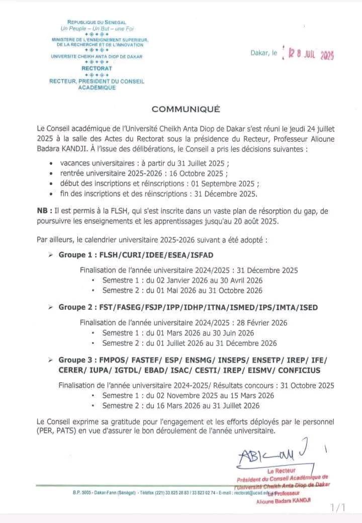 Le Conseil académique de l’Université Cheikh Anta Diop de Dakar s’est réuni le jeudi 24 juillet 2025, dans la salle des Actes du Rectorat, sous la présidence du Recteur, le Professeur Alioune Badara KANDJI.