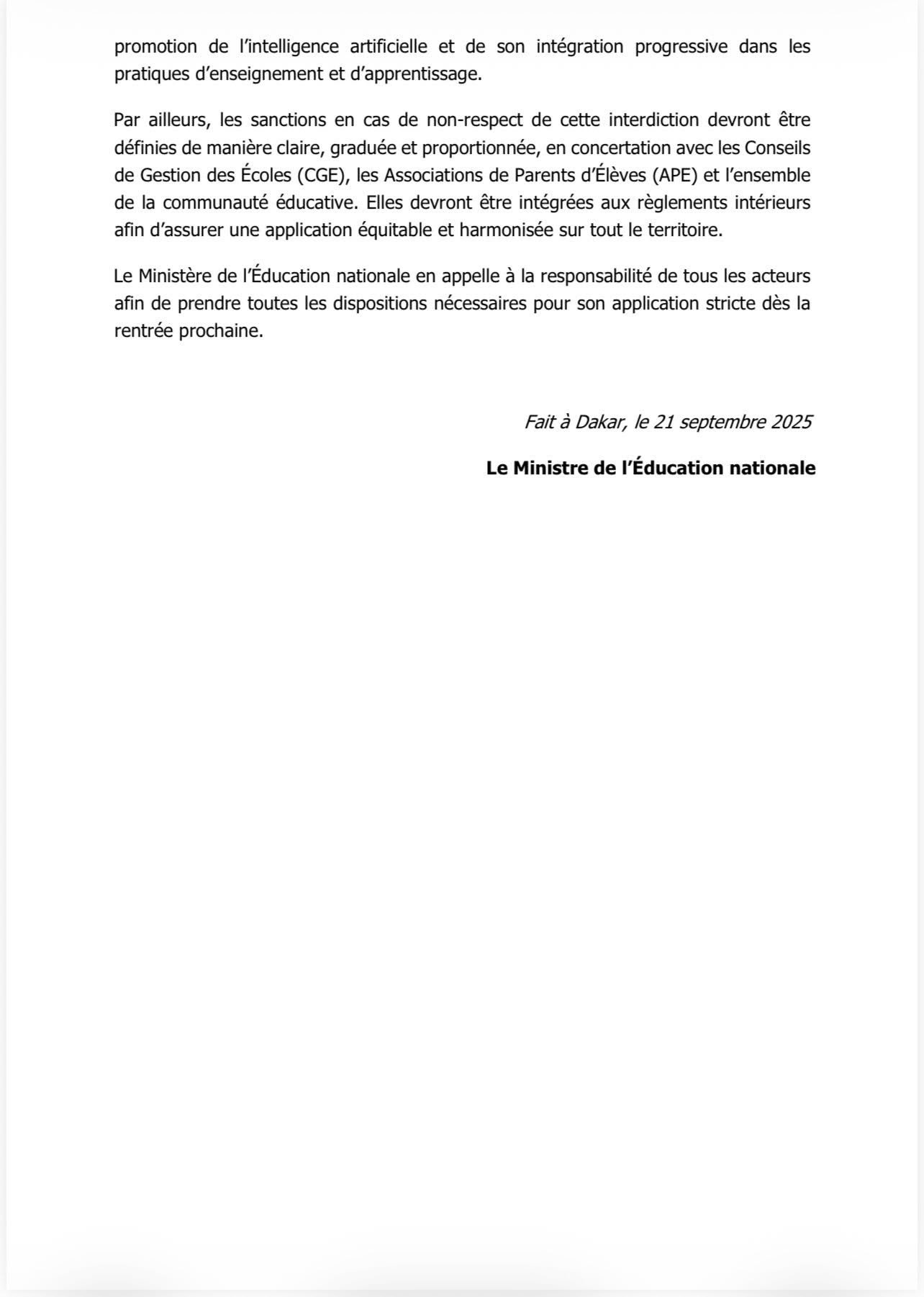 Education du Sénégal : Interdiction de l’usage du téléphone en milieu scolaire 22 septembre 2025 Commenter Screenshot Screenshot ETIQUETTESEducation du Sénégal Partager cet article Facebook Twitter Whatsapp Whatsapp LinkedIn Email Copy Link Commenter Laisser un commentaire Annuler la réponseVotre adresse e-mail ne sera pas publiée. Les champs obligatoires sont indiqués avec *Commentaire * Nom * E-mail * Site web Enregistrer mon nom, mon e-mail et mon site dans le navigateur pour mon prochain commentaire. Δ Les plus vues Comment faire une demande d’emploi dans la fonction publique? Démarches Communiqué du Ministre de L’enseignement Supérieur , de la Recherche et de L’innovation Actualités Ouverture du concours de recrutement d’élèves – maîtres 2024 (CREM) Concours CREM BAC 2025 –Tout ce qu’il faut savoir sur les premiers résultats Baccalauréat Resultats concours /examens Appel à Candidature pour le recrutement de plusieurs Enseignants Emplois Recrutement Les plus récents IGTDL_UCAD vous propose le Master Gouvernance territoriale et Politiques Publiques Emplois Recrutement Eazy Visa recrute un Stagiaire Comptable Emplois Recrutement Terre des Hommes Lausanne recrute un Stagiaire Assistante de Direction Emplois Recrutement RMO Sénégal recrute un Cadre Chargé(e) des Opérations Emplois Recrutement jangalma recrute 100 professeurs rentrée 2025-2026 Emplois Recrutement