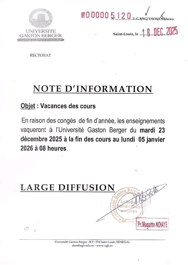 Education du Sénégal : UGB _ vacances des cours en raison des congés de fin d’année. 18 décembre 2025 Commenter Partager cet article Facebook Twitter Whatsapp Whatsapp LinkedIn Email Copy Link Commenter Laisser un commentaire Annuler la réponseVotre adresse e-mail ne sera pas publiée. Les champs obligatoires sont indiqués avec *Commentaire * Nom * E-mail * Site web Enregistrer mon nom, mon e-mail et mon site dans le navigateur pour mon prochain commentaire. Δ Les plus vues Comment faire une demande d’emploi dans la fonction publique? Démarches Communiqué du Ministre de L’enseignement Supérieur , de la Recherche et de L’innovation Actualités Ouverture du concours de recrutement d’élèves – maîtres 2024 (CREM) Concours CREM BAC 2025 –Tout ce qu’il faut savoir sur les premiers résultats Baccalauréat Resultats concours /examens Appel à Candidature pour le recrutement de plusieurs Enseignants Emplois Recrutement Les plus récents OFFRES DE RECRUTEMENT Emplois Recrutement jangalma recrute un Professeur Emplois Recrutement MBS recrute un Interprète Billingue CHINOIS-ANGLAIS Emplois Recrutement CONCOURS ARMÉE DE L’ AIR Concours jangalma recrute un Professeur Emplois Recrutement