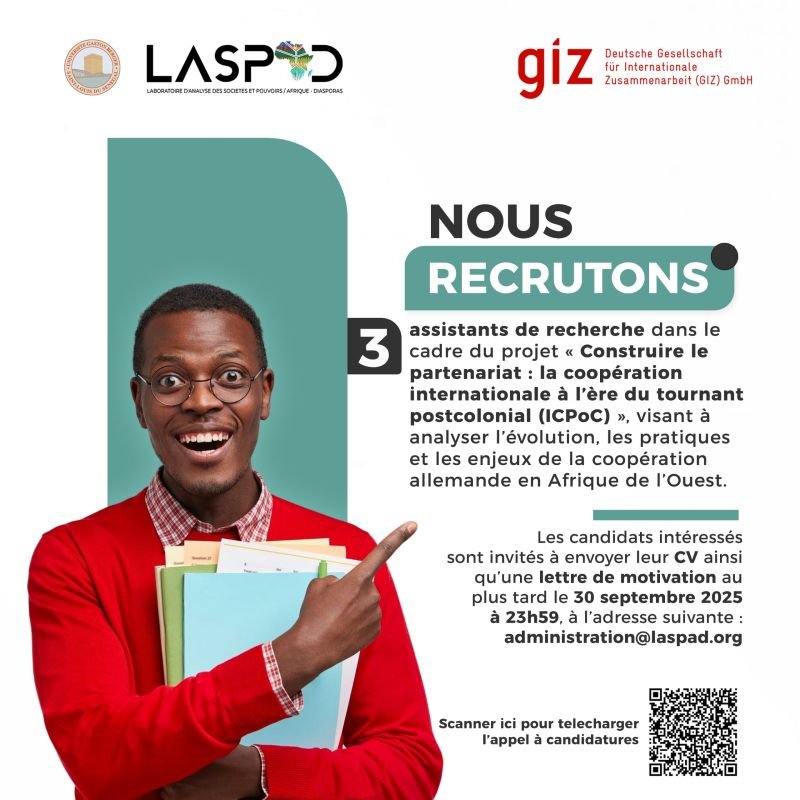Le LASPAD, en partenariat avec la GIZ, recrute 3 assistant·e·s de recherche dans le cadre du projet Construire le partenariat : la coopération internationale à l’ère du tournant postcolonial (ICPoC).