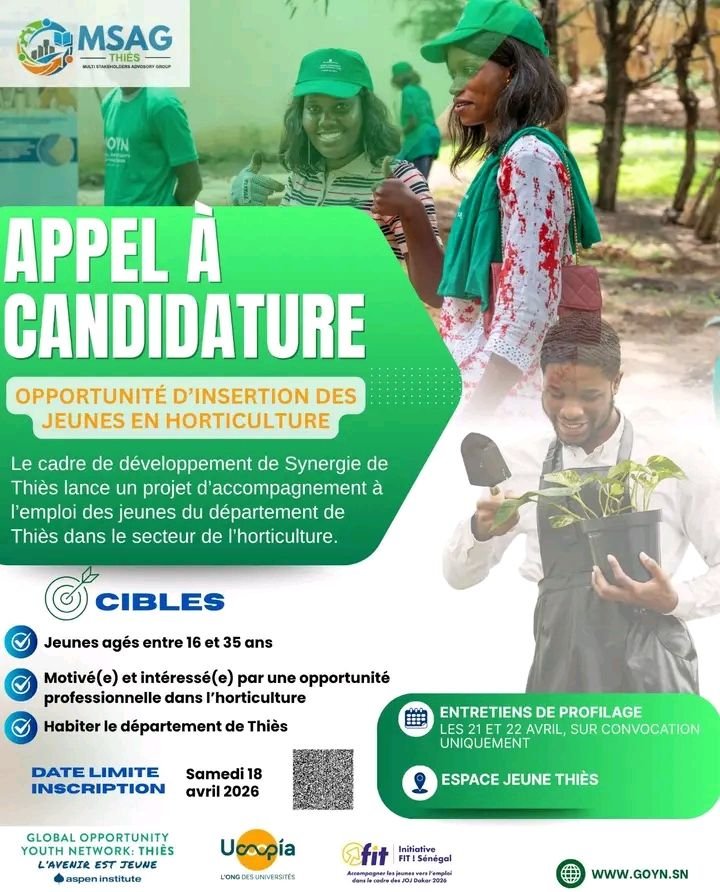 Dans le cadre d’un projet d’accompagnement à l’emploi des jeunes dans le secteur de l’horticulture, nous lançons un appel à candidatures destiné aux jeunes du département de Thiès.
