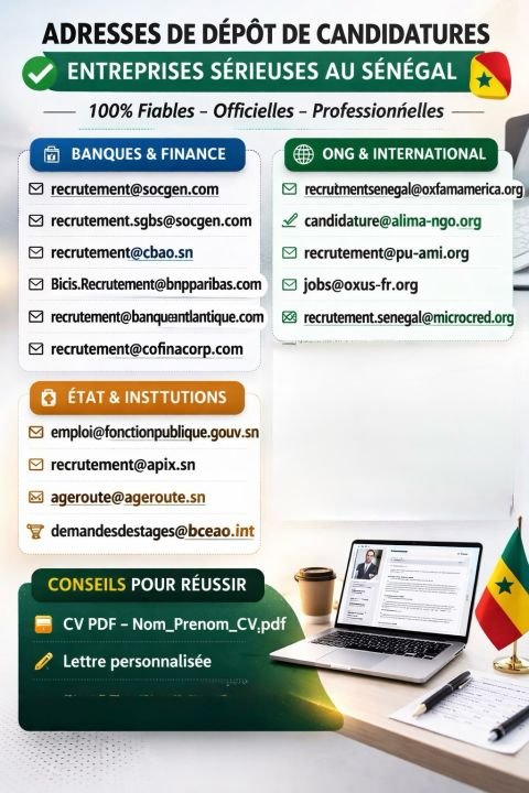 Pour les candidats souhaitant déposer une candidature spontanée, voici une liste d’adresses institutionnelles au Sénégal.