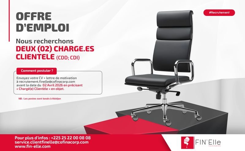 Nous recherchons deux (2) Chargé(e)s clientèle. 27 mars 2026 Commenter Nous recherchons deux (2) Chargé(e)s clientèle. ETIQUETTESChargé Partager cet article Facebook Twitter Whatsapp Whatsapp LinkedIn Email Copy Link Commenter Laisser un commentaire Annuler la réponseVotre adresse e-mail ne sera pas publiée. Les champs obligatoires sont indiqués avec *Commentaire * Nom * E-mail * Site web Enregistrer mon nom, mon e-mail et mon site dans le navigateur pour mon prochain commentaire. Δ Les plus vues Comment faire une demande d’emploi dans la fonction publique? Démarches Communiqué du Ministre de L’enseignement Supérieur , de la Recherche et de L’innovation Actualités Ouverture du concours de recrutement d’élèves – maîtres 2024 (CREM) Concours CREM BAC 2025 –Tout ce qu’il faut savoir sur les premiers résultats Baccalauréat Resultats concours /examens Concours Eaux et Forêts / Session 2025 : Conditions, Dates et Documents à fournir Concours Les plus récents Une entreprise de la place recrute une Gérante institut de beauté soins et bien être Emplois Recrutement Recrutement d’un Assistant IT Chargé du Support Emplois Recrutement PERFECT LADY RECRUTE PLUSIEURS PROFILS Emplois Recrutement Concours de recrutement exceptionnel spécifique Concours Recrutement Institut EHI recrute un Lancement de la 6e Cohorte de Formation Humanitaire Emplois Recrutement