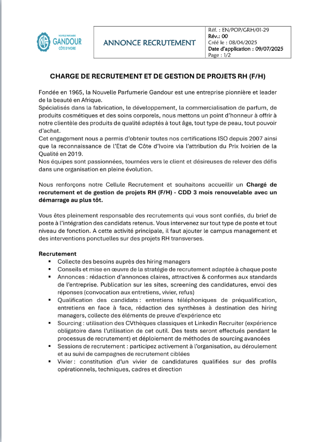Nous recrutons un Chargé de Recrutement et de Gestion de Projets RH (H/F).