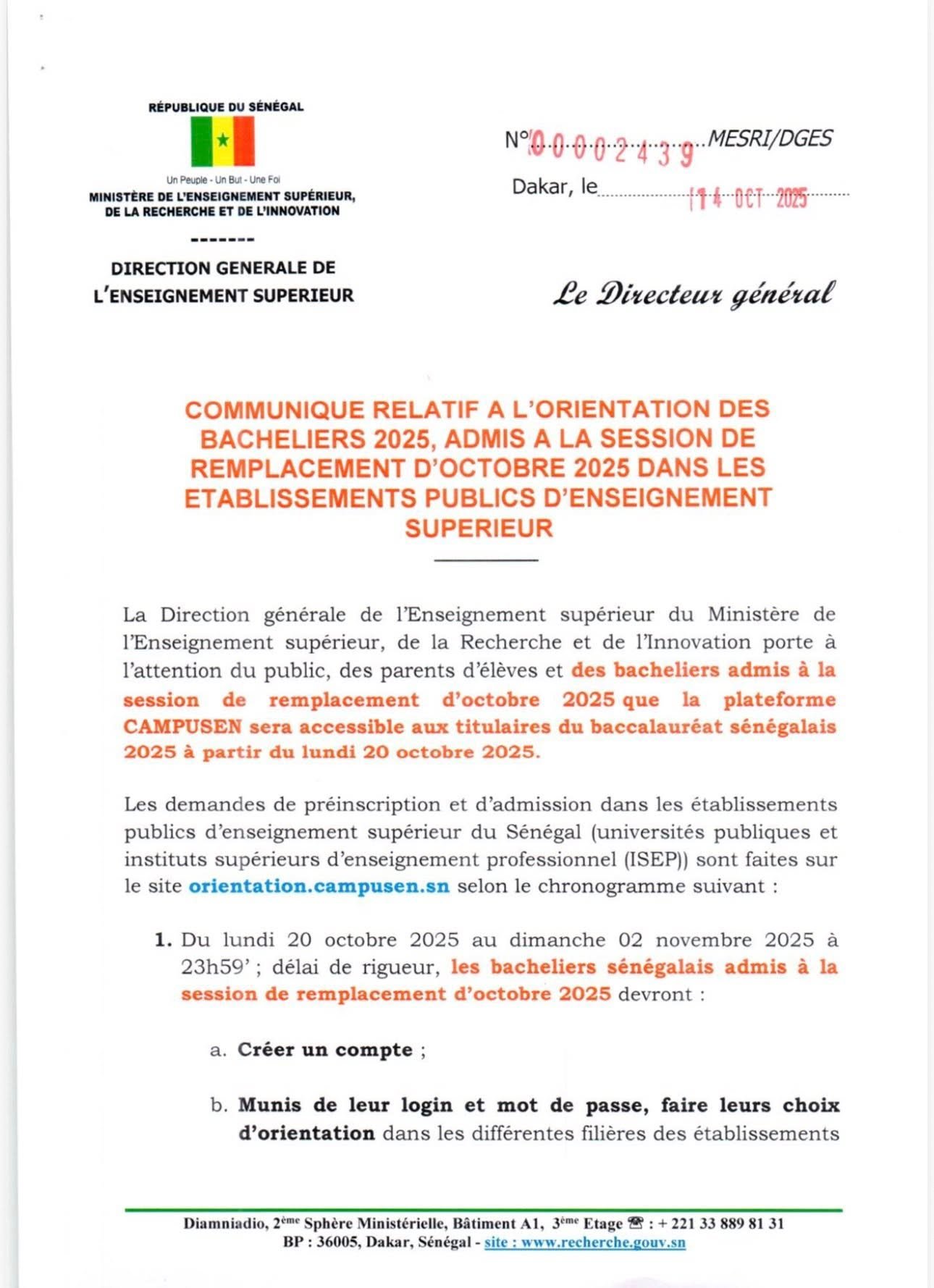 Communiqué : Orientation des bacheliers 2025, admis à la session de remplacement d’octobre 2025 dans les établissements publics d’enseignement supérieur