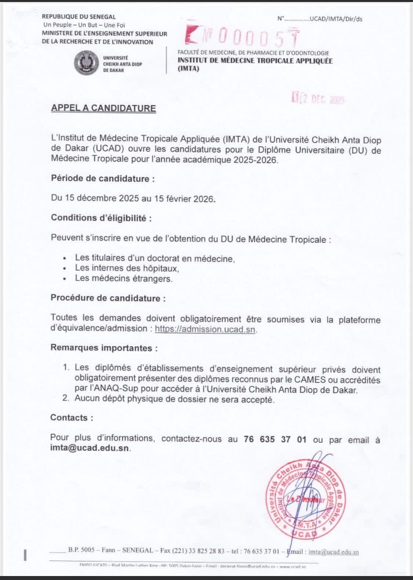 L’Institut de Médecine Tropicale Appliquée #IMTA_UCAD ouvre les candidatures pour le Diplôme Universitaire (DU) de Médecine Tropicale au titre de l’année académique 2025–2026.
