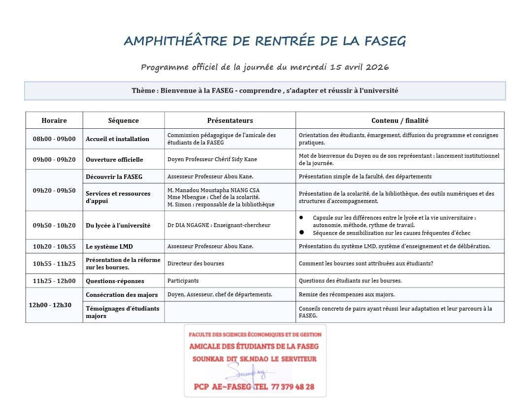 Programme Amphi de Rentrée FASEG 2025-2026 14 avril 2026 Commenter Programme Amphi de Rentrée FASEG 2025-2026 Partager cet article Facebook Twitter Whatsapp Whatsapp LinkedIn Email Copy Link Commenter Laisser un commentaire Annuler la réponseVotre adresse e-mail ne sera pas publiée. Les champs obligatoires sont indiqués avec *Commentaire * Nom * E-mail * Site web Enregistrer mon nom, mon e-mail et mon site dans le navigateur pour mon prochain commentaire. Δ Les plus vues Comment faire une demande d’emploi dans la fonction publique? Démarches Communiqué du Ministre de L’enseignement Supérieur , de la Recherche et de L’innovation Actualités Ouverture du concours de recrutement d’élèves – maîtres 2024 (CREM) Concours CREM BAC 2025 –Tout ce qu’il faut savoir sur les premiers résultats Baccalauréat Resultats concours /examens Concours Eaux et Forêts / Session 2025 : Conditions, Dates et Documents à fournir Concours Les plus récents Recrutement en plusieurs Profils en communication, audiovisuel et multimédia Emplois Recrutement REPORT DU SYMPOSIUM NATIONAL SUR L’ENSEIGNEMENT PRIVÉ Actualités CONCOURS D’ENTRÉE AU CESTI CESTI Concours Recrutement d’une agence de communication Emplois Recrutement IBS recrute des profils techniques pour renforcer ses équipes Emplois Recrutement