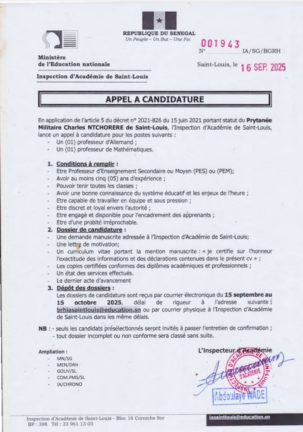 Prytanée Militaire Charles N’Tchorere de Saint-Louis: Appel à candidature pour le poste de