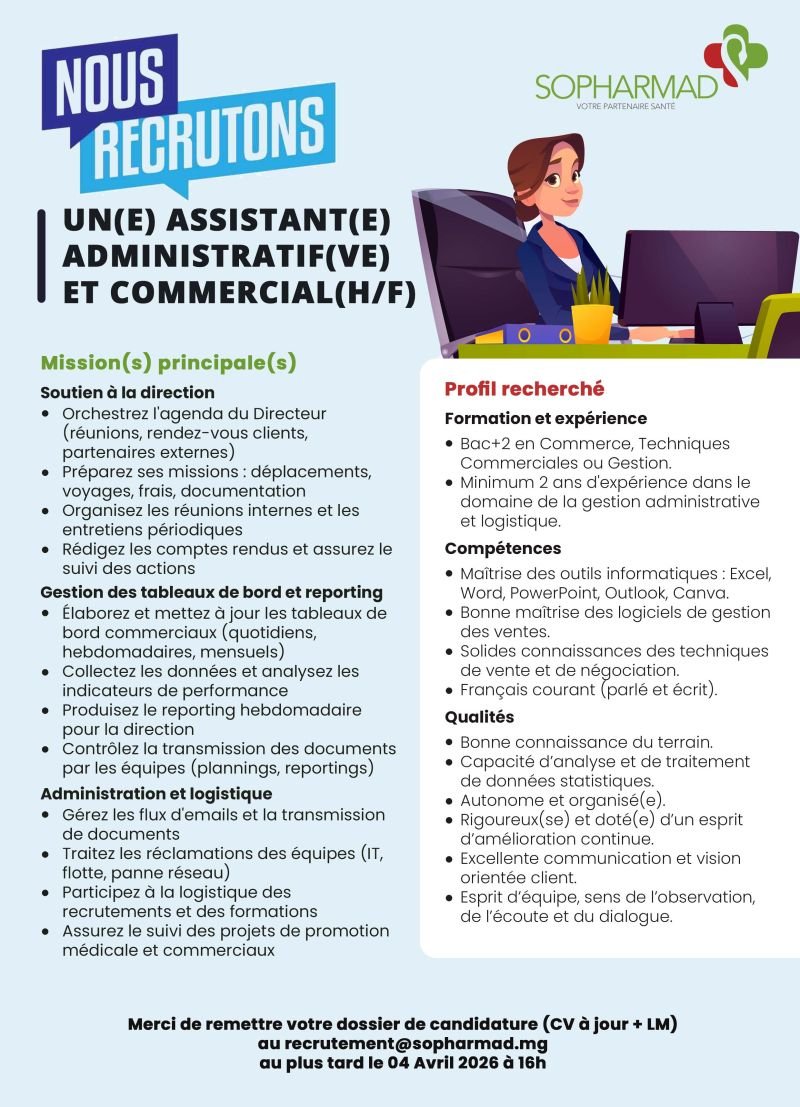 📩 Candidatures (CV + lettre) à : recrutement@sopharmad.mg
