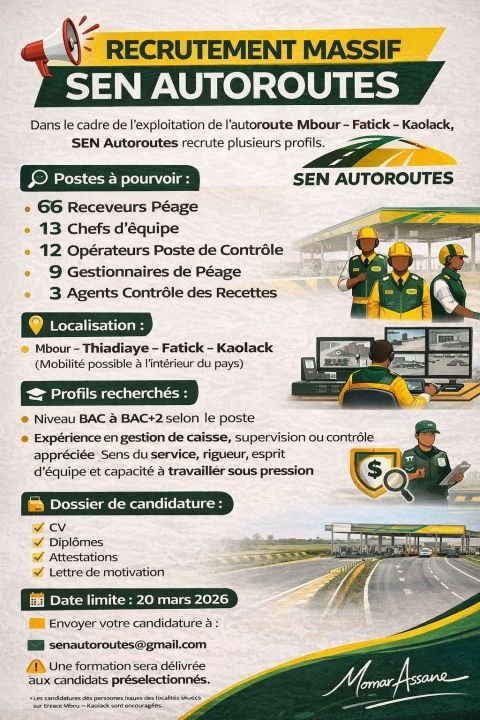 Dans le cadre de l’exploitation de l’autoroute Mbour – Fatick – Kaolack, SEN Autoroutes recrute plus de 100 agents.
