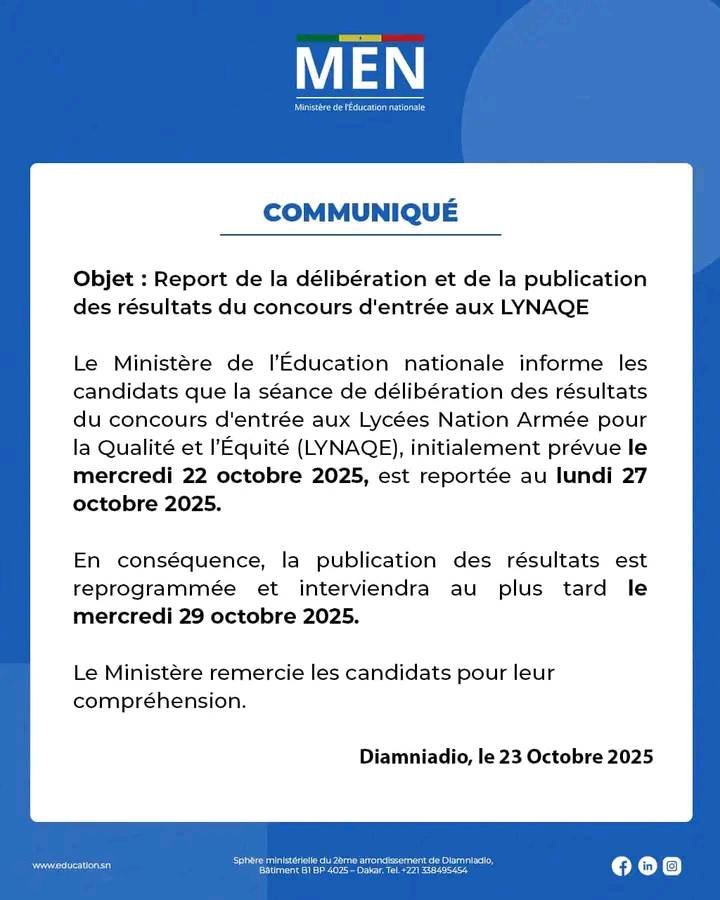 Report de la délibération et de le publication des résultats du concours d’entrée au LYNAQE 24 octobre 2025 Commenter ETIQUETTESConcours Partager cet article Facebook Twitter Whatsapp Whatsapp LinkedIn Email Copy Link Commenter Laisser un commentaire Annuler la réponseVotre adresse e-mail ne sera pas publiée. Les champs obligatoires sont indiqués avec *Commentaire * Nom * E-mail * Site web Enregistrer mon nom, mon e-mail et mon site dans le navigateur pour mon prochain commentaire. Δ Les plus vues Comment faire une demande d’emploi dans la fonction publique? Démarches Communiqué du Ministre de L’enseignement Supérieur , de la Recherche et de L’innovation Actualités Ouverture du concours de recrutement d’élèves – maîtres 2024 (CREM) Concours CREM BAC 2025 –Tout ce qu’il faut savoir sur les premiers résultats Baccalauréat Resultats concours /examens Appel à Candidature pour le recrutement de plusieurs Enseignants Emplois Recrutement Les plus récents Bawers Medical Technologies recrute un Stage en secrétariat bureautique Emplois Recrutement Notre agence recrute un Standardistes Emplois Recrutement Phoenix Consulting Group SN recrute un HR Manager bilingue Emplois Recrutement RESULTATS FASTEF MASTER MATHEMATIQUE Concours Resultats concours /examens UCAD Appel à Candidature UAM Concours UAM