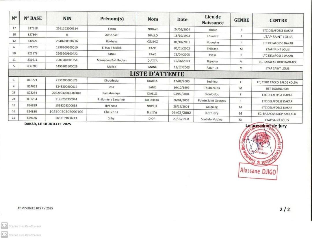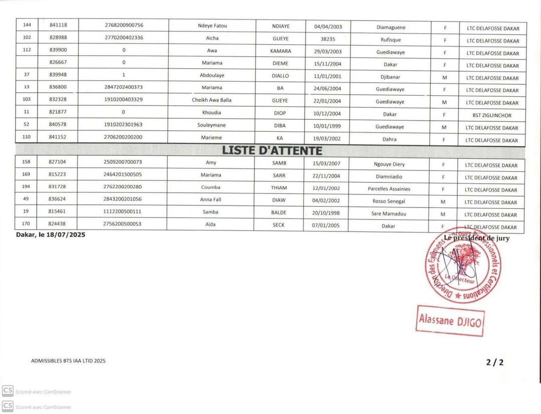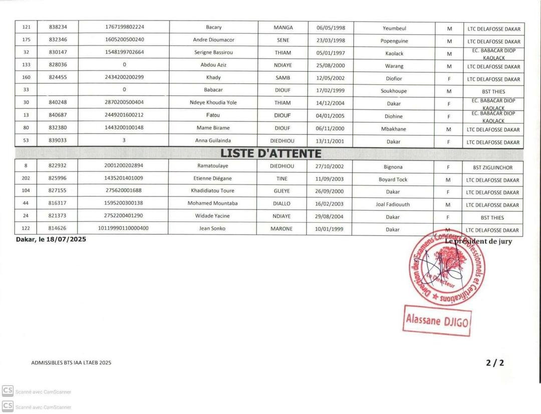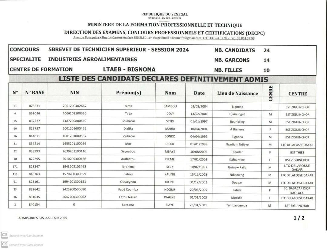 Résultats admis définitifs concours BTS industries Agroalimentaires session 2025