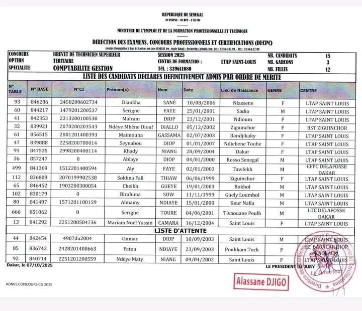 Résultats définitifs BTS COMPTABILITÉ ET GESTION Centre SAINT-LOUIS_ 23 octobre 2025 Commenter Résultats définitifs BTS COMPTABILITÉ ET GESTION Centre SAINT-LOUIS_ ETIQUETTESBTS COMPTABILITÉ ET GESTION Partager cet article Facebook Twitter Whatsapp Whatsapp LinkedIn Email Copy Link Commenter Laisser un commentaire Annuler la réponseVotre adresse e-mail ne sera pas publiée. Les champs obligatoires sont indiqués avec *Commentaire * Nom * E-mail * Site web Enregistrer mon nom, mon e-mail et mon site dans le navigateur pour mon prochain commentaire. Δ Les plus vues Comment faire une demande d’emploi dans la fonction publique? Démarches Communiqué du Ministre de L’enseignement Supérieur , de la Recherche et de L’innovation Actualités Ouverture du concours de recrutement d’élèves – maîtres 2024 (CREM) Concours CREM BAC 2025 –Tout ce qu’il faut savoir sur les premiers résultats Baccalauréat Resultats concours /examens Appel à Candidature pour le recrutement de plusieurs Enseignants Emplois Recrutement Les plus récents OUVERTURE DES INSCRIPTIONS À LA FORMATION À DISTANCE 2025-2026 Actualités Education Résultats concours FASTEF 2025 : Les résultats des candidats admissibles en Anglais Concours FASTEF Resultats concours /examens ETS recrute un Stagiaire Menuisier Emplois Recrutement Recrutement des commerciaux terrain Emplois Recrutement Les Barbus recrute un Directeur Artistique Emplois Recrutement