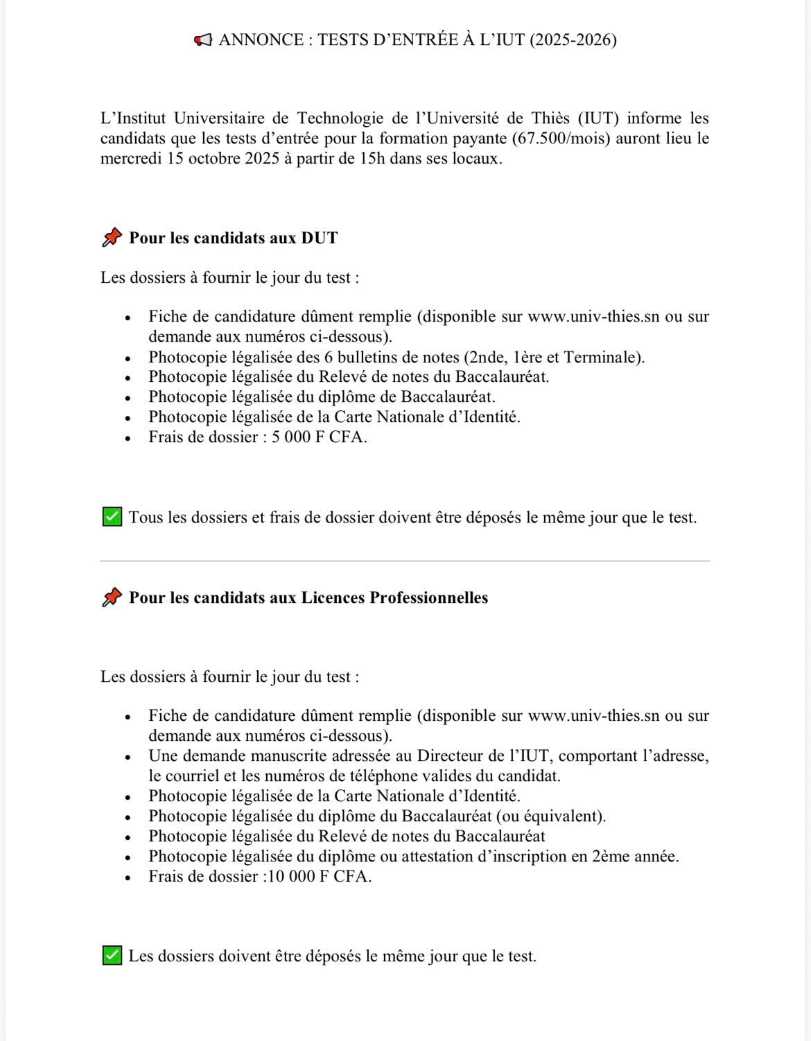 Tests d’entrée pour la formation payante se tiendront le mercredi 15 Octobre 2025 à l’IUT de Thiès 4 octobre 2025 Commenter Les tests d’entrée pour la formation payante se tiendront le mercredi 15 Octobre 2025 à l’IUT de Thiès Partager cet article Facebook Twitter Whatsapp Whatsapp LinkedIn Email Copy Link Commenter Laisser un commentaire Annuler la réponseVotre adresse e-mail ne sera pas publiée. Les champs obligatoires sont indiqués avec *Commentaire * Nom * E-mail * Site web Enregistrer mon nom, mon e-mail et mon site dans le navigateur pour mon prochain commentaire. Δ Les plus vues Comment faire une demande d’emploi dans la fonction publique? Démarches Communiqué du Ministre de L’enseignement Supérieur , de la Recherche et de L’innovation Actualités Ouverture du concours de recrutement d’élèves – maîtres 2024 (CREM) Concours CREM BAC 2025 –Tout ce qu’il faut savoir sur les premiers résultats Baccalauréat Resultats concours /examens Appel à Candidature pour le recrutement de plusieurs Enseignants Emplois Recrutement Les plus récents IGTDL_UCAD vous propose le Master Gouvernance territoriale et Politiques Publiques Emplois Recrutement Eazy Visa recrute un Stagiaire Comptable Emplois Recrutement Terre des Hommes Lausanne recrute un Stagiaire Assistante de Direction Emplois Recrutement RMO Sénégal recrute un Cadre Chargé(e) des Opérations Emplois Recrutement jangalma recrute 100 professeurs rentrée 2025-2026 Emplois Recrutement