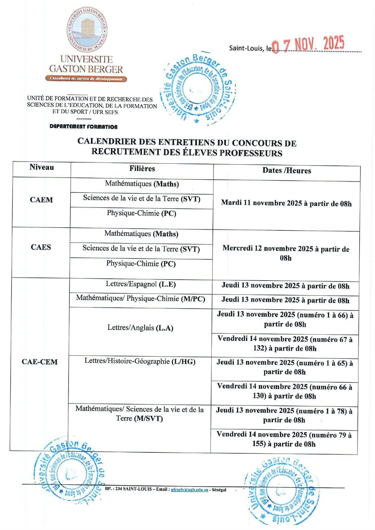 UGB : Calendrier entretien concours 10 novembre 2025 Commenter ETIQUETTESCalendrier Partager cet article Facebook Twitter Whatsapp Whatsapp LinkedIn Email Copy Link Commenter Laisser un commentaire Annuler la réponseVotre adresse e-mail ne sera pas publiée. Les champs obligatoires sont indiqués avec *Commentaire * Nom * E-mail * Site web Enregistrer mon nom, mon e-mail et mon site dans le navigateur pour mon prochain commentaire. Δ Les plus vues Comment faire une demande d’emploi dans la fonction publique? Démarches Communiqué du Ministre de L’enseignement Supérieur , de la Recherche et de L’innovation Actualités Ouverture du concours de recrutement d’élèves – maîtres 2024 (CREM) Concours CREM BAC 2025 –Tout ce qu’il faut savoir sur les premiers résultats Baccalauréat Resultats concours /examens Appel à Candidature pour le recrutement de plusieurs Enseignants Emplois Recrutement Les plus récents Agence hybride recrute une Cuisinière & Femme de ménage Emplois Recrutement Particulier recrute un livreur moto ( scooter) Emplois Recrutement AVIS CANDIDATS INDIVIDUELS BAC 2026 Baccalauréat Examens Établissement d’enseignement supérieur privé recrute plusieurs profils Emplois Recrutement Recrutement d’une Conseillère chargée de relations publiques (RP) Emplois Recrutement