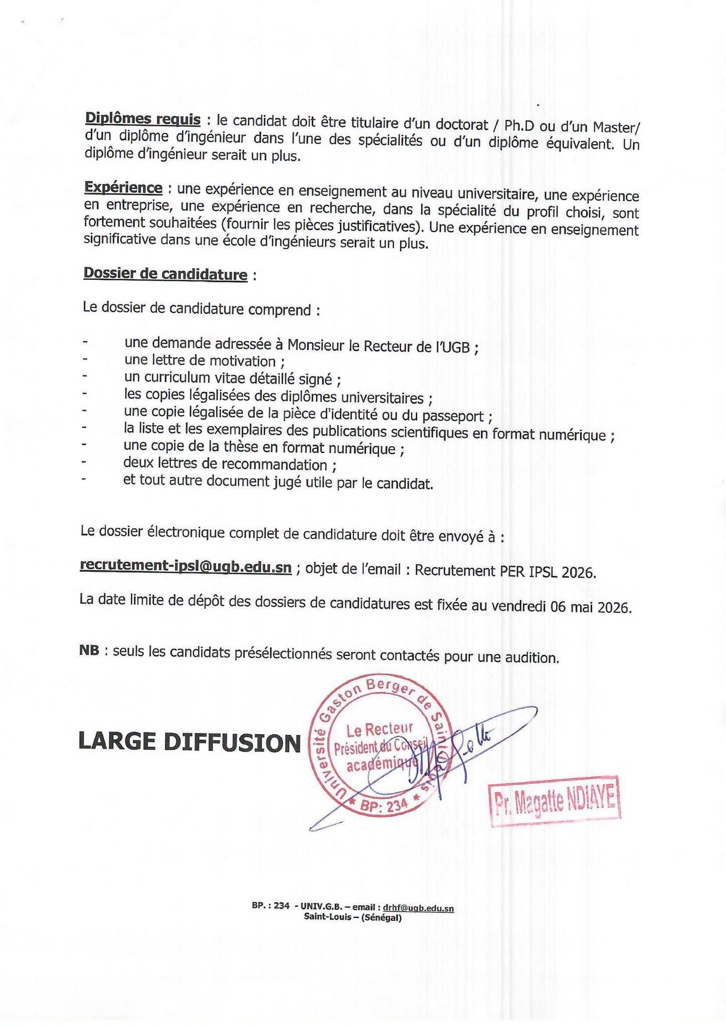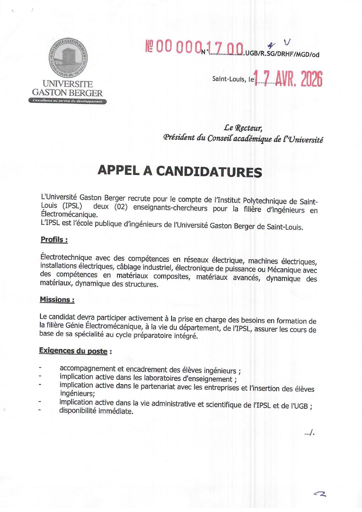 L’Université Gaston Berger recrute deux (02) enseignants-chercheurs pour renforcer la filière d’ingénieurs en électromécanique de l’Institut Polytechnique de Saint-Louis.