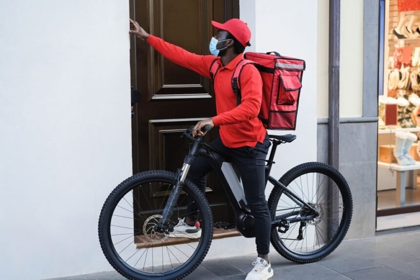 African delivery man with electric bike ringing the doorbell - Focus on face